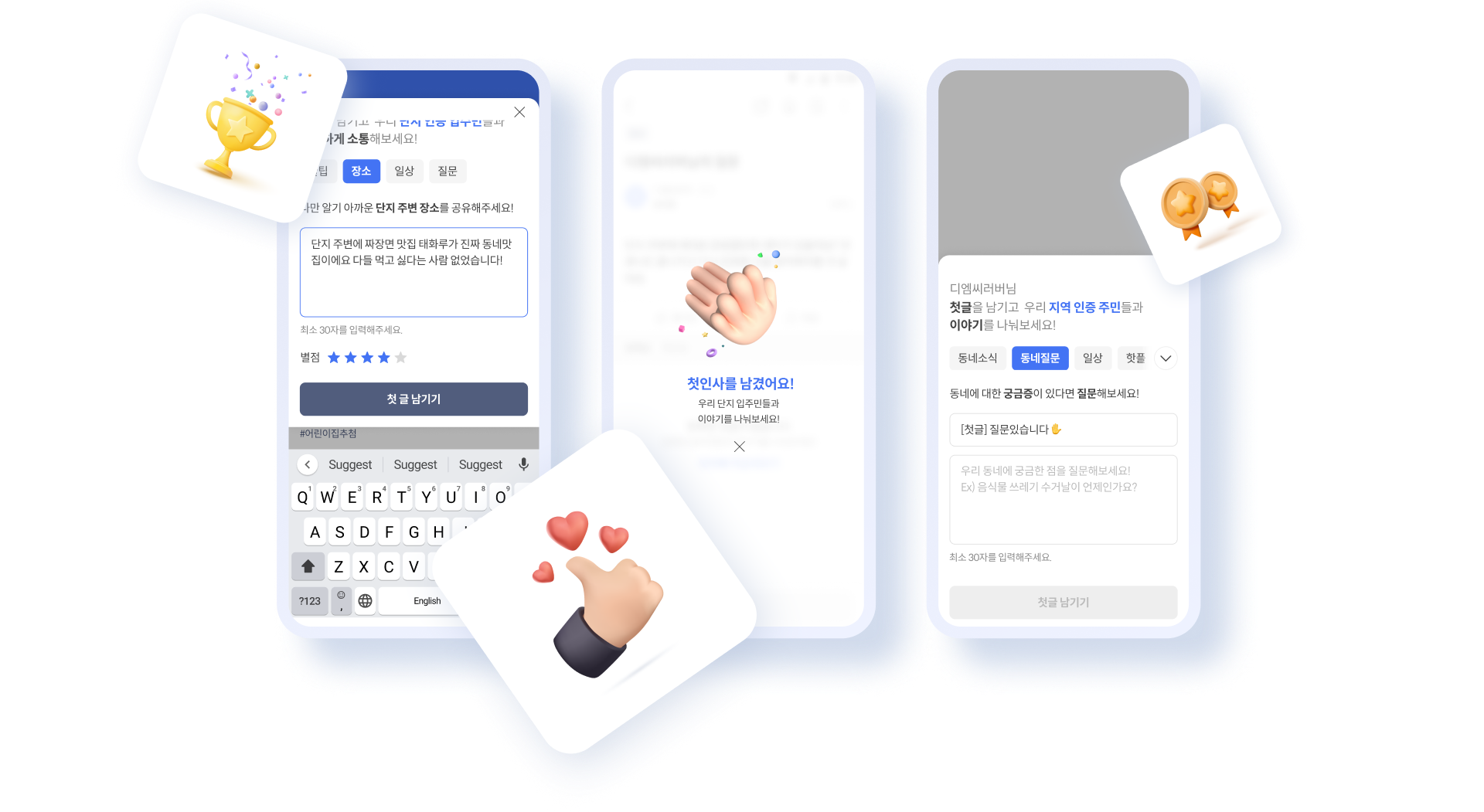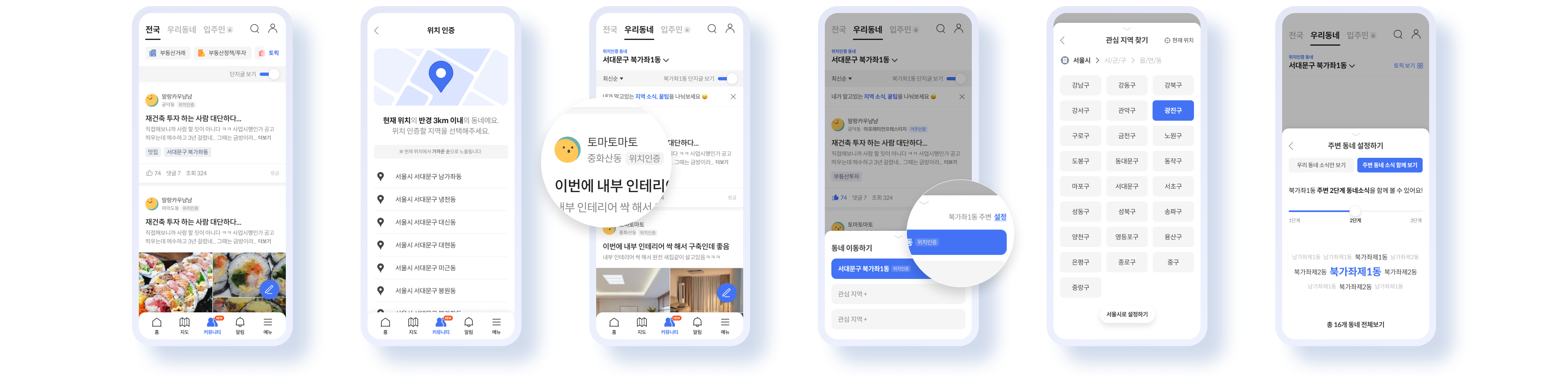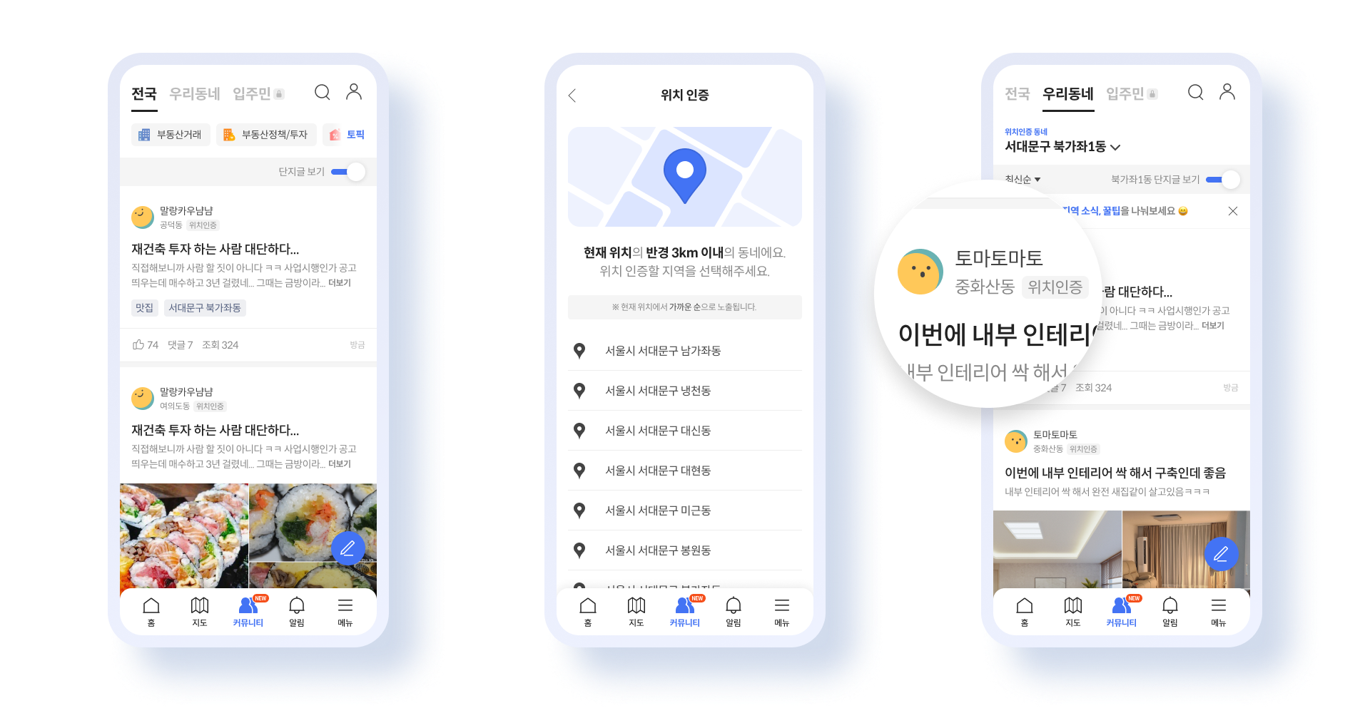 커뮤니티를 시작하면 현재 위치를 인증 합니다. 프로필에 인증한 위치의 지역명이 표시되고, 전국의 모든 읍면동 게시판이 제공됩니다.