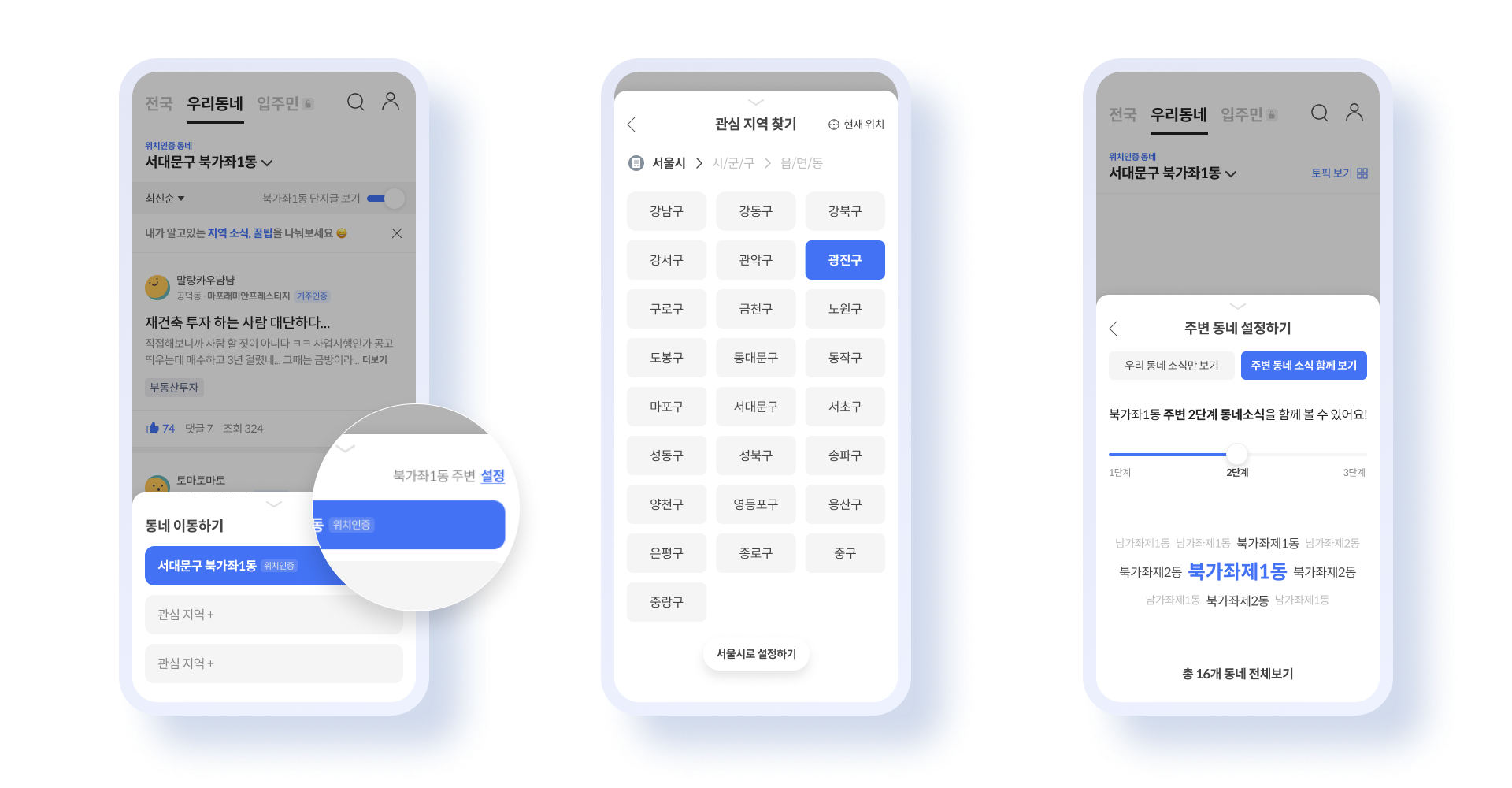 자유롭게 게시판을 이동할 수 있고, 관심 지역을 설정하거나 주변 지역까지 넓혀서 이용할 수 있습니다.
