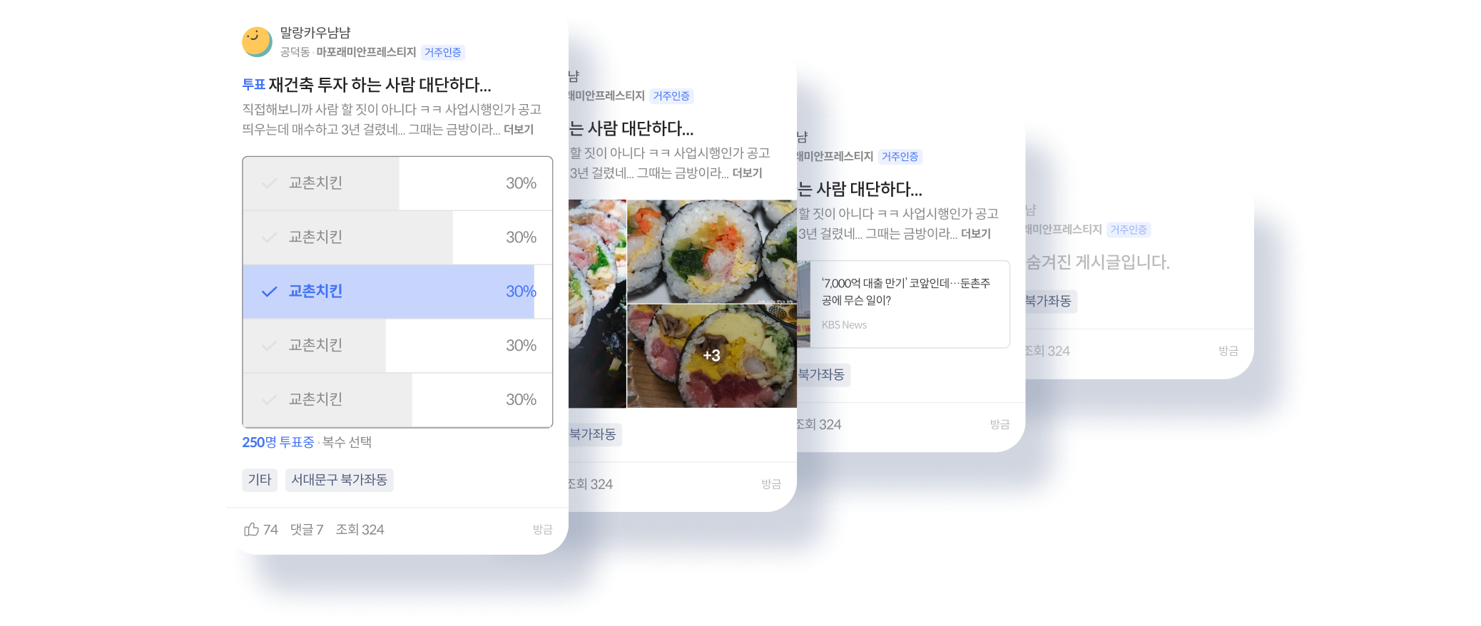 마이데이터를 인증하면, 사용자가 실제 거주 중인 단지의 게시판이 생성됩니다.