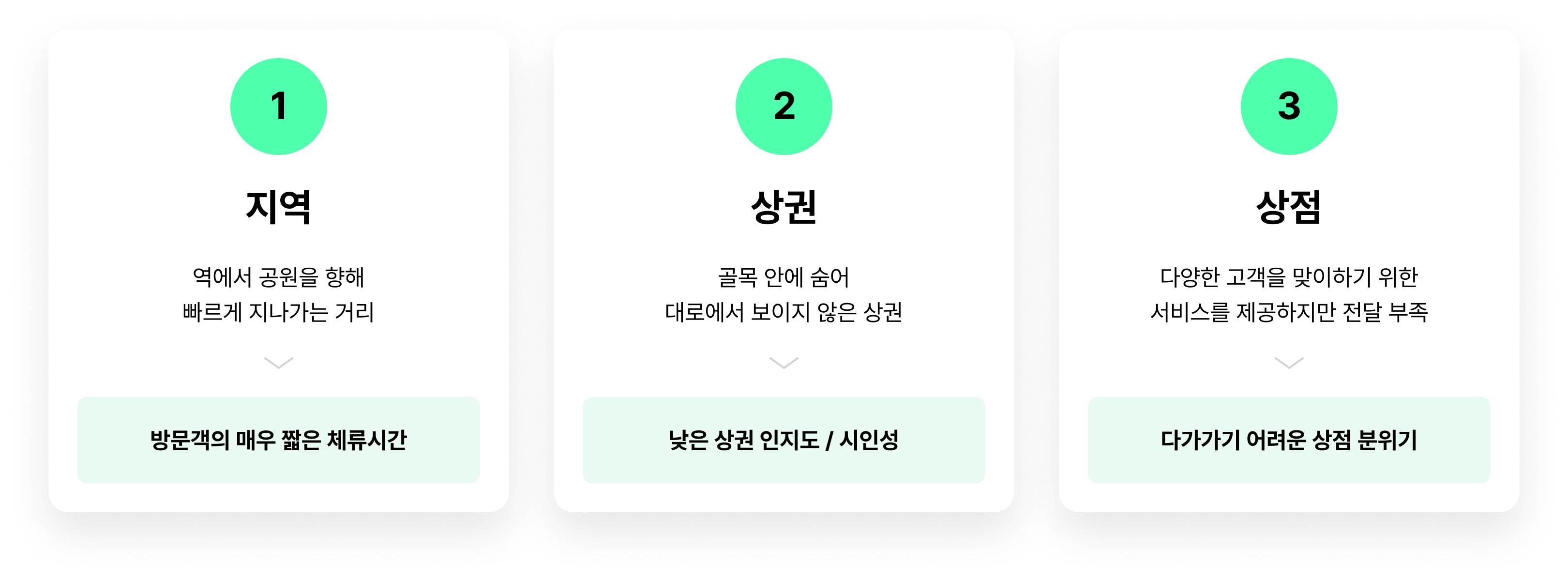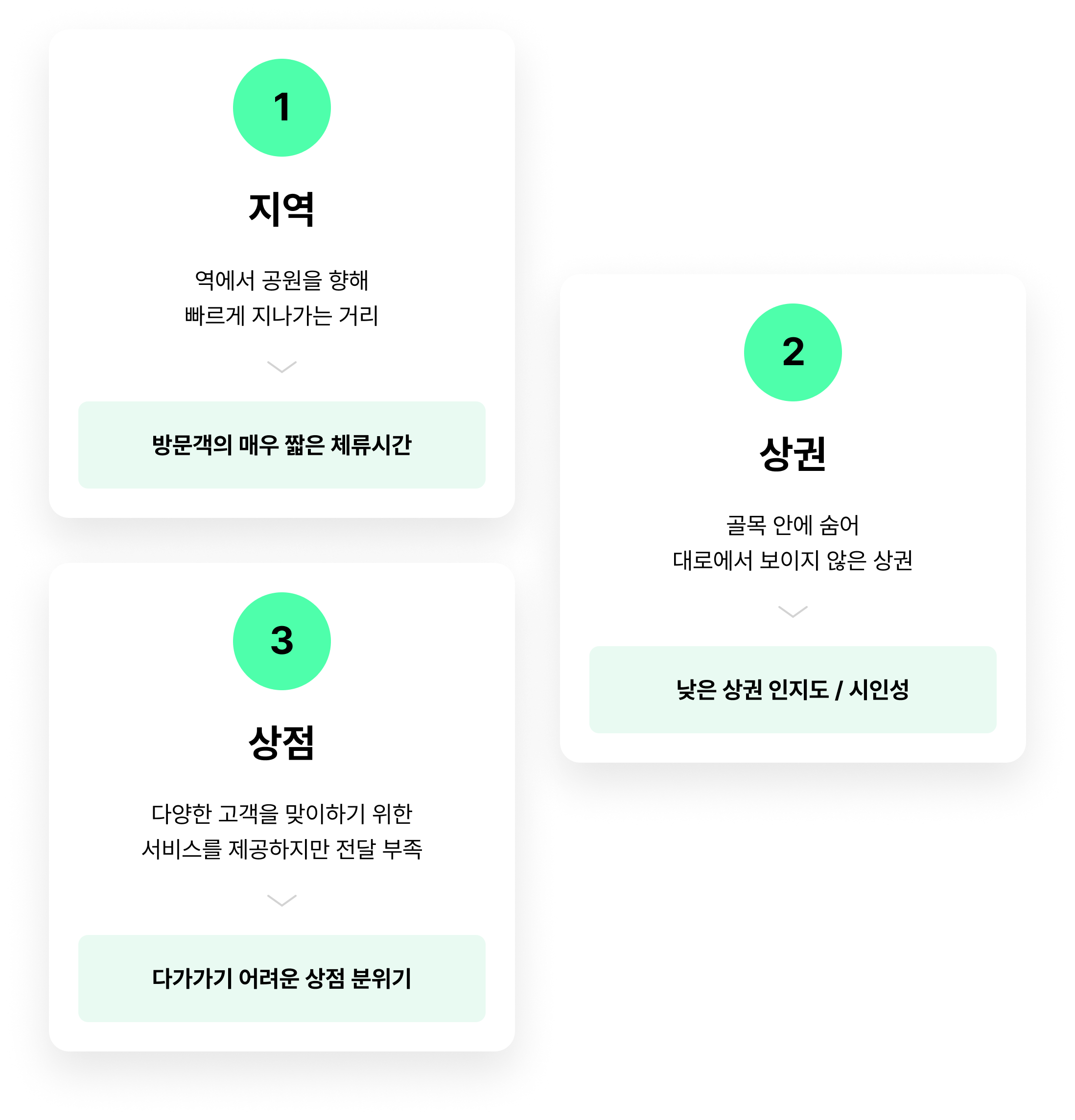 인터뷰, 관철, 방문객 동선 · 보행속도 등 다각적 조사 및 분석을 기반으로 대상지 상권의 핵심 문제를 도출하여 이를 기반으로 디자인 전략을 수립하였습니다.