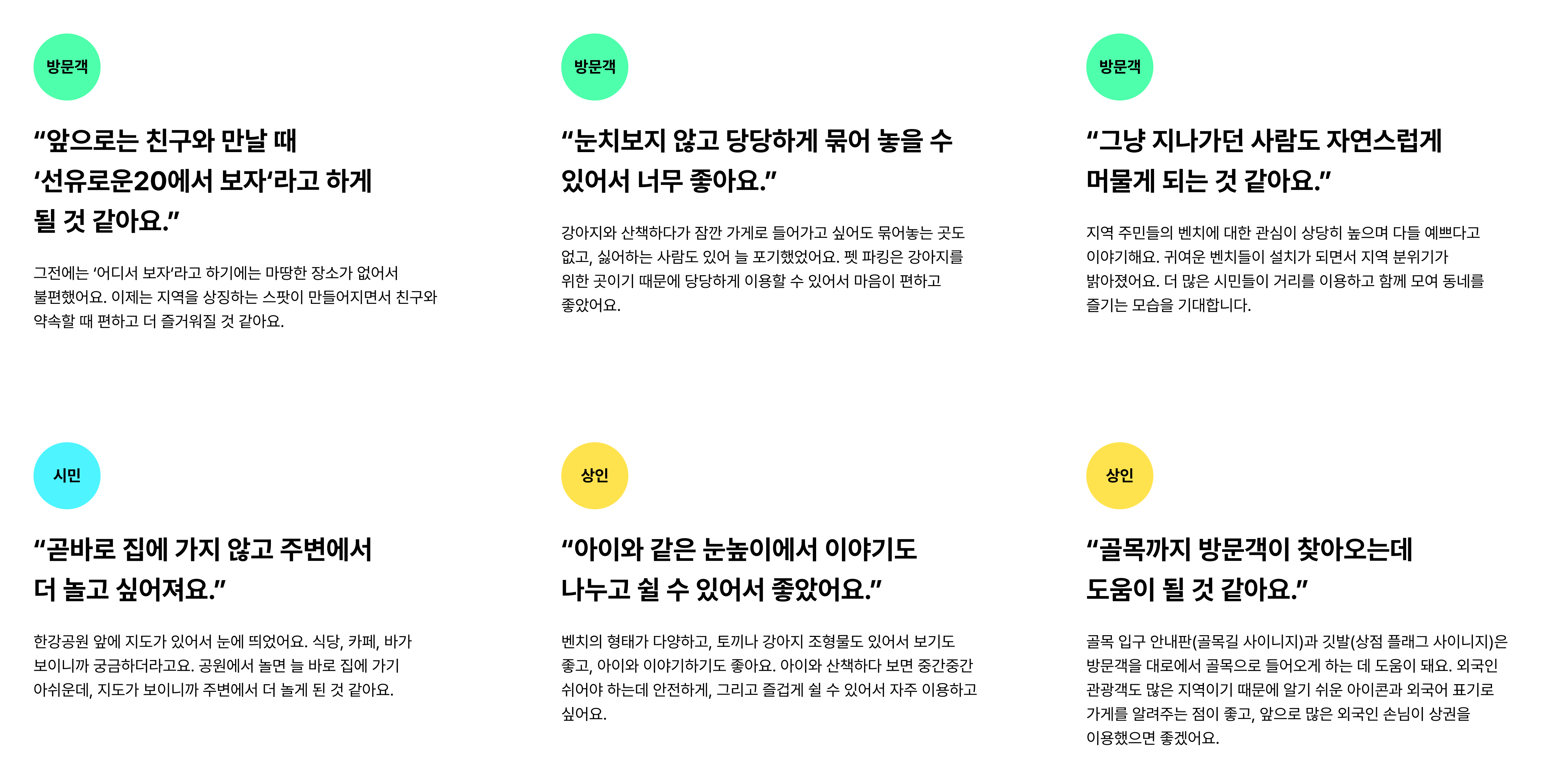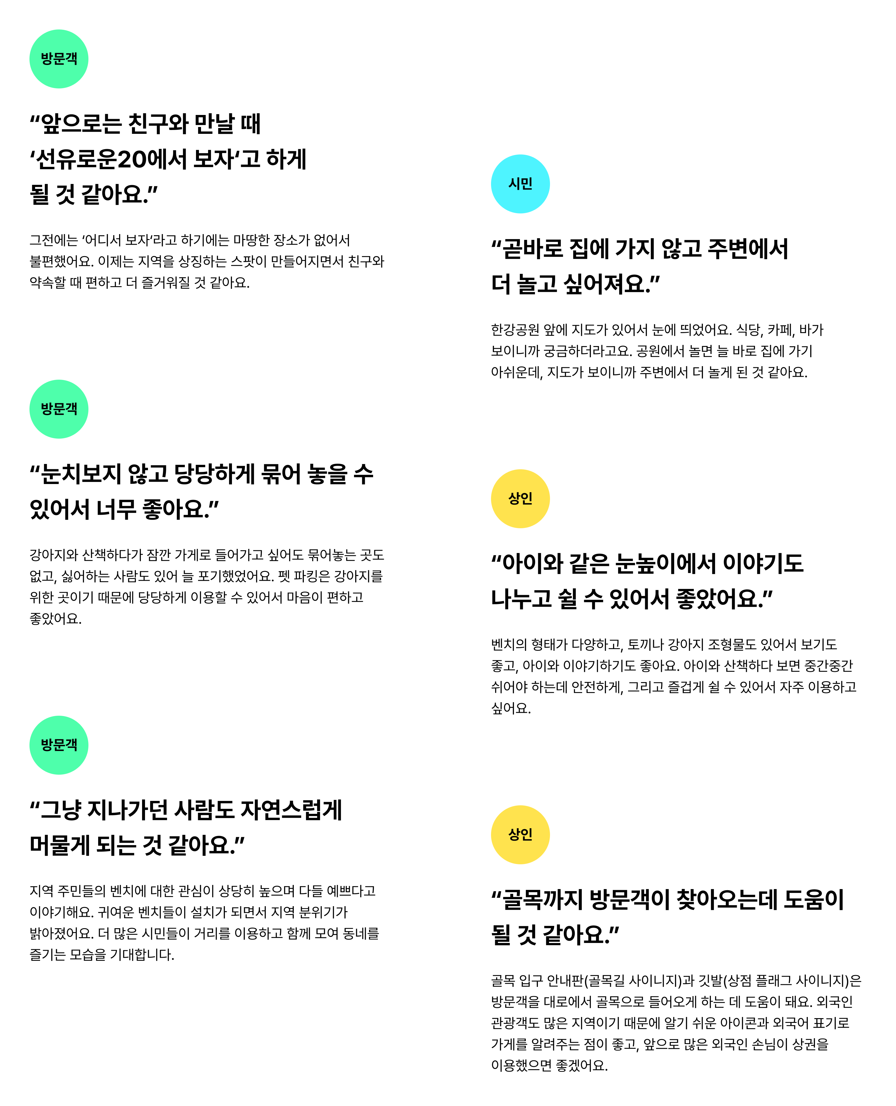 상권을 더 많이, 더 즐겁게 이용할 수 있도록 만드는 <선유로운20>, 앞으로 많은 시민이 이용하면서 상권에 활기를 줄 것을 기대합니다.