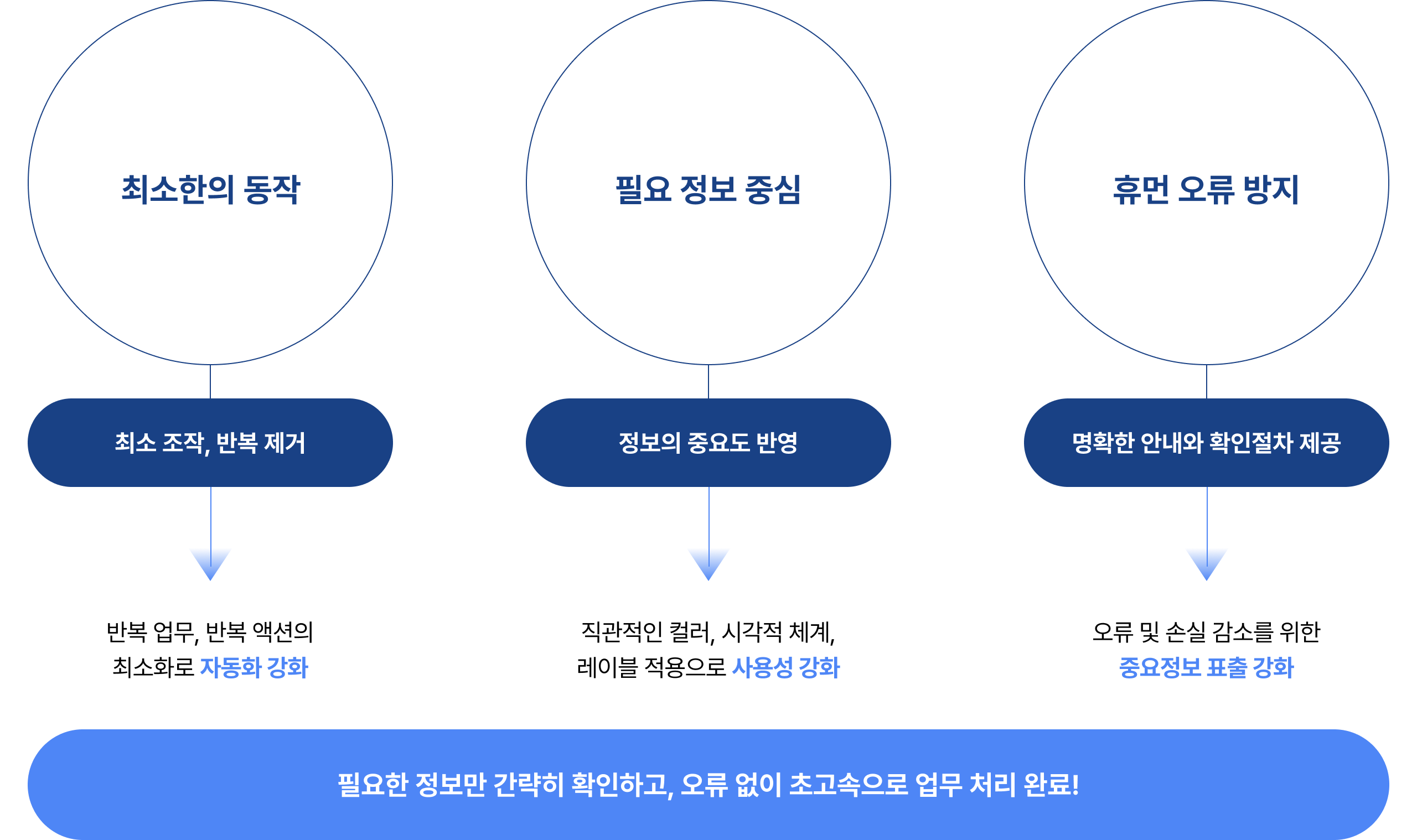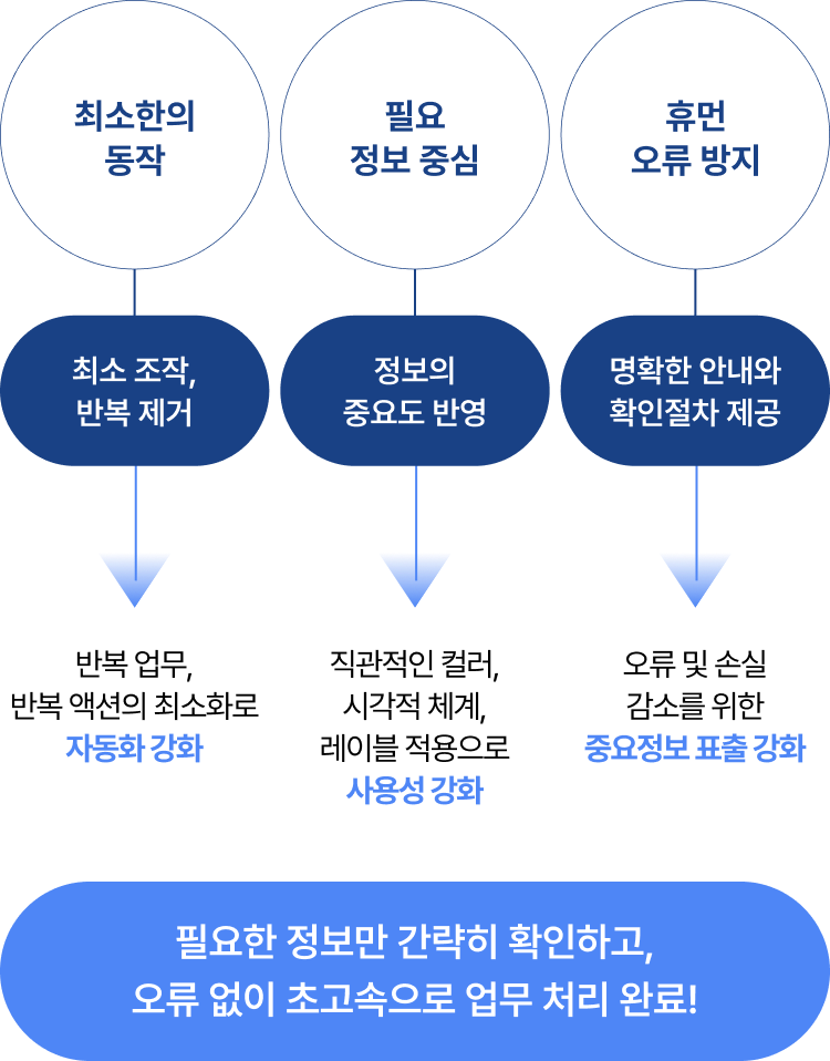 목록에서 확인이 필요한 정보의 우선순위를 강조하고, 숨겨져 있는 중요한 정보가 없도록 정보 구조를 개선하였습니다. 오류상황에 대해서 빠른 인지와 수정이 가능하도록 디자인을 진행하여 편의성과 사용성을 증대하였습니다.