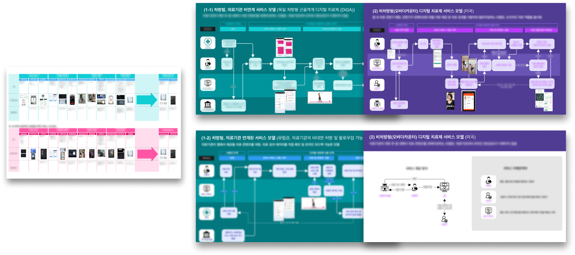 디지털치료제 서비스의 국내 환경과 보다 앞서 활성화된 해외 디지털치료제 환경에서의 서비스모델 특징을 파악해 국내 환경에 적용 가능한 서비스 방향을 연구하고, AI, 스마트미러 등 XR 서비스의 UX 요건과 트랜드를 분석했습니다.