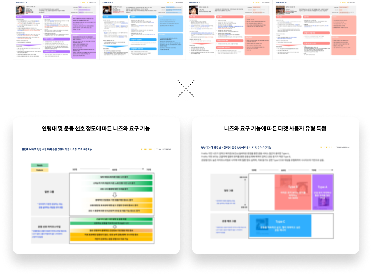타겟의 노화 단계(Frailty)와 근골격계질환 경험에 따라 대상 범위를 특정하고, 대상 유형 별 사용자 인터뷰 조사를 통해 타겟 사용자 유형 별 니즈와 페인포인트를 도출했습니다.
