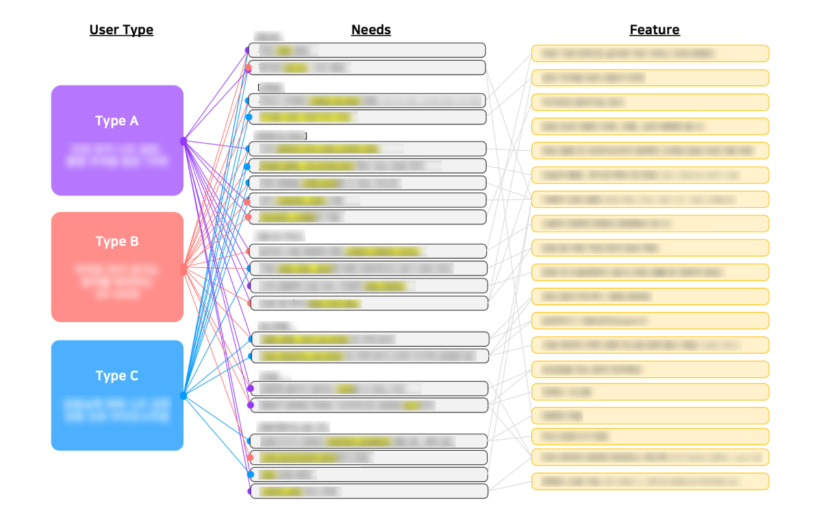 대상 유형 별 사용자 인터뷰 조사를 통해 타겟 사용자 유형 별 니즈와 페인포인트를 도출했습니다.